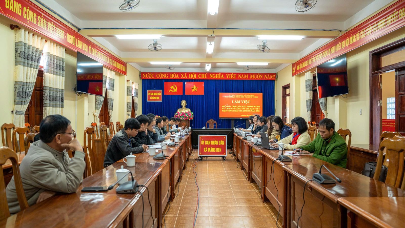 Tham dự buổi làm việc có đồng chí Nguyễn Nhật Trường, Phó Chủ tịch UBND xã Măng Đen, cùng đại diện các bộ phận chuyên môn, tổ trưởng tổ dân phố và đội ngũ điều tra viên trực tiếp thực hiện Tổng điều tra trên địa bàn.