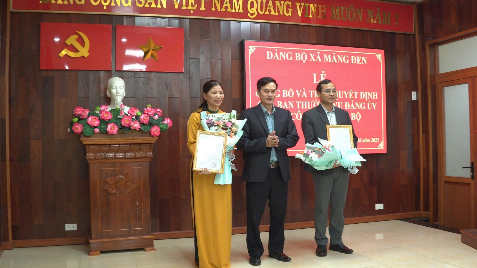 Tại buổi lễ, lãnh đạo Ban Xây dựng Đảng công bố Quyết định của Ban Thường vụ Đảng ủy về bổ nhiệm đồng chí Mai Xuân Mậu, Viên chức Trung tâm Chính trị xã giữ chức Phó Giám đốc Trung tâm Chính trị xã Măng Đen; Bổ nhiệm đồng chí Hoàng Thị Hợp, Uỷ viên Ban Chấp hành Đảng bộ, Phó Giám đốc Trung tâm Chính trị xã giữ chức Giám đốc Trung tâm Chính trị xã Măng Đen. Thời hạn bổ nhiệm 05 năm. Các Quyết định có hiệu lực từ ngày 31/10/2025.