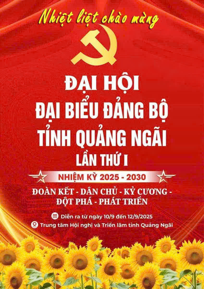 Đại hội Đảng bộ tỉnh Quảng Ngãi lần thứ nhất diễn ra từ ngày 10/9 đến ngày 12/9/2025. Chính thức khai mạc vào lúc 7h30' ngày 11/9/2025 tại Trung tâm Hội nghị và Triển lãm tỉnh. Chủ đề Đại hội nhấn mạnh xây dựng Đảng, phát huy đại đoàn kết, đột phá khoa học- công nghệ, chuyển đổi số, phát triển nhanh và bền vững, phấn đấu đến 2030 trở thành tỉnh phát triển khá.