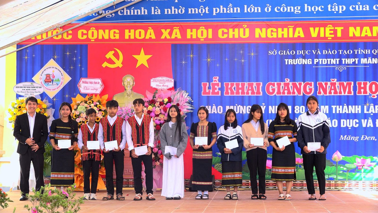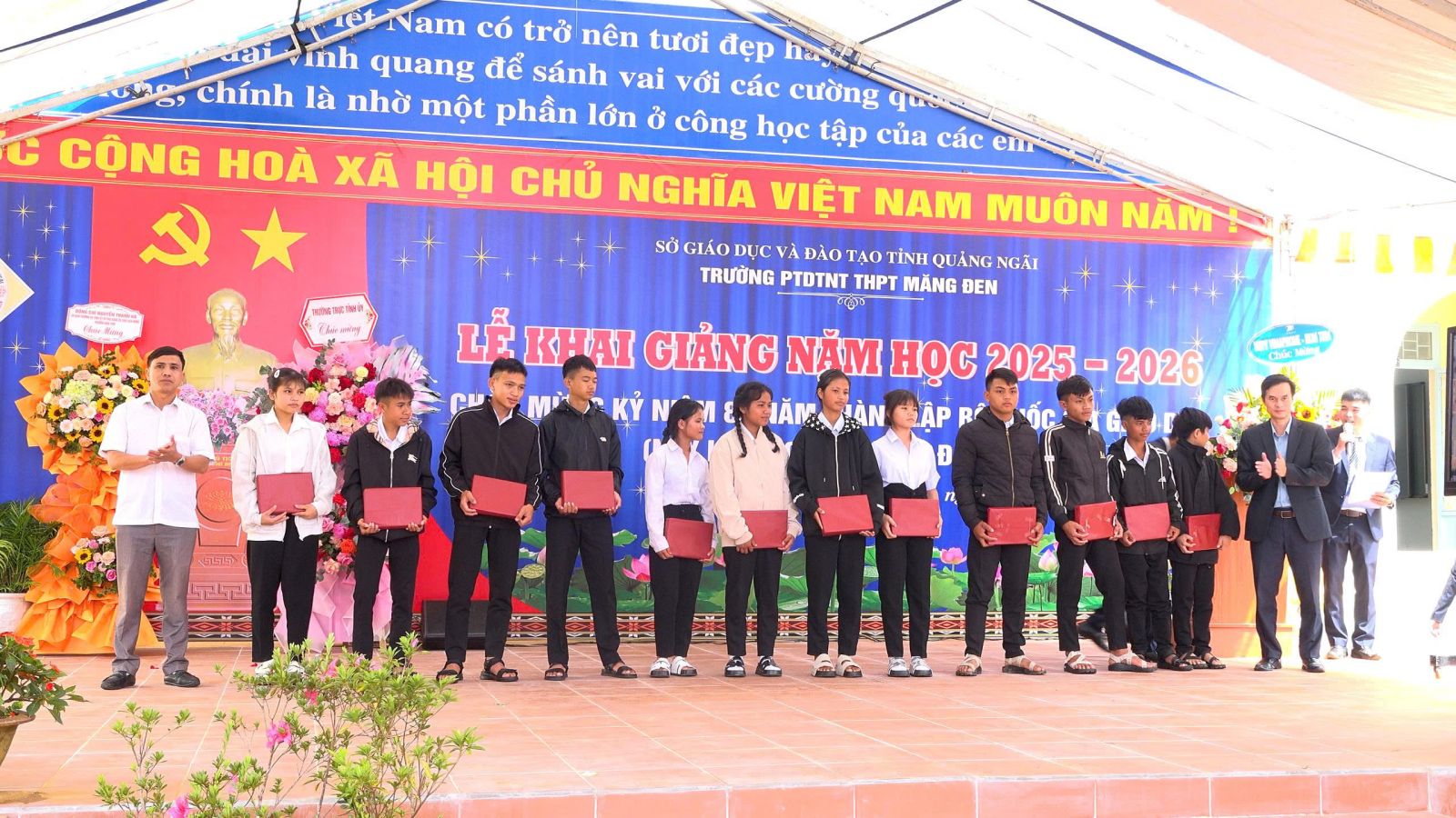Nhân dịp này, Nhà trường trao thưởng cho học sinh lớp 12 đạt thành tích xuất sắc Kỳ thi TN THPT 2025 và thủ khoa đầu vào lớp 10. Đồng thời, tặng sách giáo khoa lớp 10 cho học sinh diện bán trú và không nội trú, tặng quà cho học sinh có hoàn cảnh khó khăn./